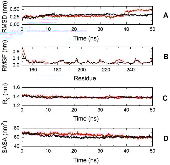 Trajectory analysis of cMyBP-CWT (black, ―) and cMyBP-CS236G (red, ―) protein fragments (residues 151-258). (A) Root mean square deviation (RMSD) of the protein backbone atoms as a function of MD simulation time. (B) Root-mean-square-fluctuations (RMSFs) of individual residues for the duration of the simulation. (C) Total radius of gyration (Rg) of the protein backbone atoms as a function of MD simulation time. (D) Solvent accessible surface area (SASA) of the protein as a function of MD simulation time.
