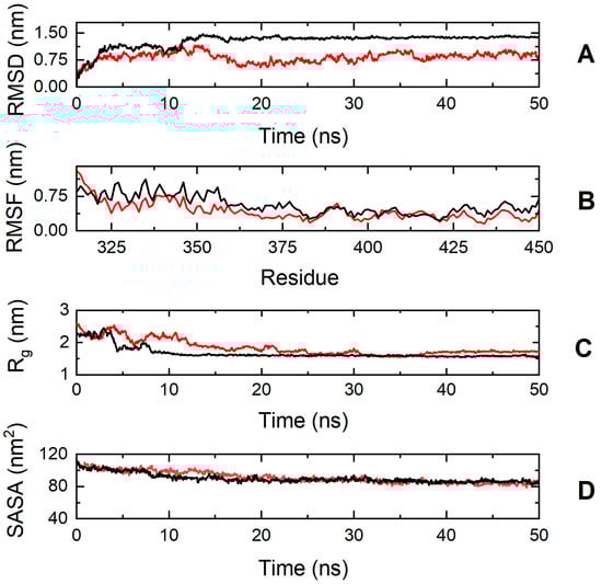 Trajectory analysis of cMyBP-CWT (black, ―) and cMyBP-CE334K (red, ―) protein fragments (residues 315-451). (A) Root mean square deviation (RMSD) of the protein backbone atoms as a function of MD simulation time. (B) Root-mean-square-fluctuations (RMSFs) of individual residues for the duration of the simulation. (C) Total radius of gyration (Rg) of the protein backbone atoms as a function of MD simulation time. (D) Solvent accessible surface area (SASA) of the protein as a function of MD simulation time.