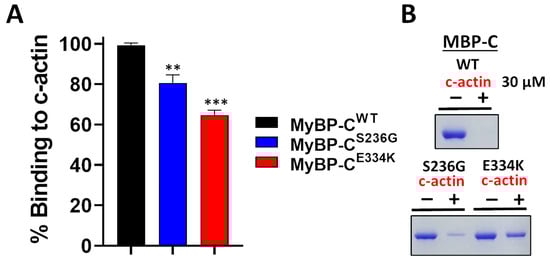 Impact of S236G and E334K mutations on the actin-binding properties of cMyBP-C. Co-sedimentation binding assays of recombinant cMyBP-CWT, cMyBP-CS236G, and cMyBP-CE334K C0–C2 protein fragments, and c-actin. Recombinant cMyBP-C proteins (2 µM) were incubated with c-actin at RT for 30 min and centrifuged at 14,000× g for 1 h. The amount of recombinant cMyBP-C proteins in the supernatant (unbound fraction) was analyzed by SDS-PAGE and quantified by Coomassie brilliant blue staining and densitometric analysis. (A) Densitometric analysis and percent normalization of the binding of recombinant cMyBP-C proteins to 30 μM of c-actin. (B) Representative SDS-PAGE gels and Coomassie brilliant blue staining following cMyBP-C recombinant protein-actin co-sedimentation assays showing the amounts of cMyBP-C recombinant proteins in supernatant fractions (unbound fraction) before (−) and after (+) co-sedimentation with 30 µM of c-actin. Statistically significant differences (asterisks) were analyzed by comparison to the binding of cMyBP-CWT using an unpaired Student’s t-test (n = 3, ** p < 0.01 and *** p < 0.01, GraphPad Prism 7 software was used to analyze the data).