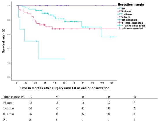 Dickinson et al. categorized [12] 303 patients based on achieved surgical margins: contaminated, <1 mm, but clear, 1–4 mm, 5–9 mm, and 10–19 mm. They concluded that “the margin can safely be as narrow as 1 mm in terms of low local recurrence rates”. However, their study did not consider critical factors such as tumor size and resection difficulty and included previously treated patients. Bilgeri et al. [8] categorized all R0 patients, including those who presented with LR and DM, into four categories, <1 mm, 1–5 mm, 5–10 mm, and >10 mm, and found that wider margins were associated with better outcomes up to 5 mm, beyond which there was no significant improvement in LRFS and overall survival.