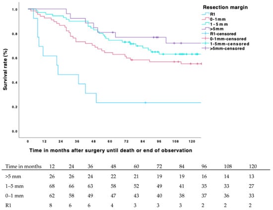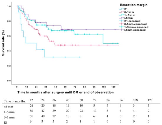 As with DMFS, if negative margins were achieved, there was no significant correlation between OS and the metrical margin width (p = 0.458; Figure 4. Again, the examined risk factors, obesity (p 0.889), high blood pressure (0.115), and smoking (0.863), did not appear to contribute to OS.