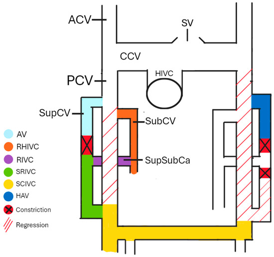 Another example of an embryological development error is the absence of the hepatic segment of the IVC with azygos continuation. This phenomenon occurs when, during embryonic development, the right SubCV (the renal part of a mature IVC) fails to connect properly to the hepatic segment of the IVC. In that case, the blood drains into the right SupCV through the right SupSubCa anastomosis. Concurrently, the hepatic veins drain directly into the right atrium. During normal development, the right SupCV loses its connection with the right SupSubCa anastomosis; however, when the hepato-subcardinal connection is not present, the pressure of the blood prevents the constriction of the connection point between the right supracardinal vein and the right SupSubCa anastomosis, causing it to stay patent. Compared to a normal AV, the AV that serves as a continuity of the IVC is significantly larger in diameter [5,44].