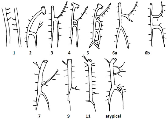 Based on the study of Anson and McVay, Kutoglu et al. further divided these three main types, which were initially described by Anson and McVay, into 11 subtypes by dissecting 48 cadavers. Subtype 1 corresponded to Type 1, subtypes 2–10 corresponded to Type 2, and subtype 11 corresponded to Type 3 (Table 1, Figure 2).