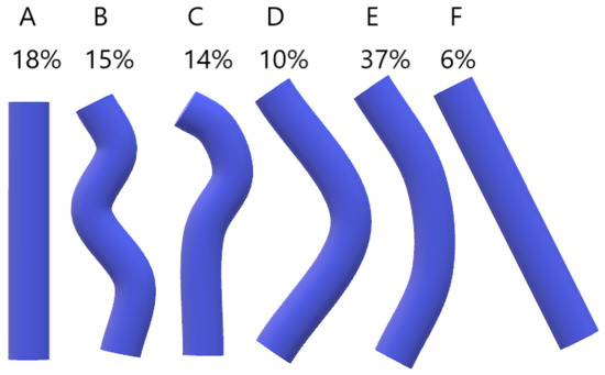 In Bergman’s Comprehensive Encyclopedia of Anatomic Variations, it is mentioned that the AV can rarely pass through the aortic hiatus of the diaphragm and open directly into the right atrium, which is attributed to the disappearance of the right common cardinal vein during embryonic development [1]. Bales [23] studied the course of the AV in 84 embalmed cadavers with removed viscera overlying the thoracic vertebrae between the aortic hiatus and tracheal bifurcation. Measurements were collected using a scalable grid overlay on a digital photograph of the internal midline view of the VC. The course of the AV was divided into five levels. Superiormost—around T4, Superior intermediate, Middle, Inferior intermediate, and Inferiormost—around T12. The horizontal position of the AV was measured at each level and classified into seven types. The results are presented in Table 6. Bales also suggested different types of overall shape for the AV (Figure 4). The most common shape of the AV was the bowed shape (E).