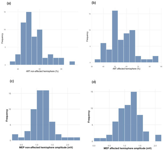 The distribution (n = 59) of rMT and MEP between the non-affected and affected brain hemispheres: (a) rMT distribution in the non-affected hemisphere (%); (b) rMT distribution in the affected hemisphere (%); (c) MEP distribution in the non-affected hemisphere (mV); (d) MEP distribution in the affected hemisphere (mV).