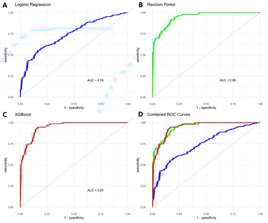 ROC curves of machine learning models for predicting ICU admission in patients with COVID-19. (A) Logistic regression model (blue line; AUC = 0.74); (B) Random Forest model (green line; AUC = 0.95); (C) XGBoost model (red line; AUC = 0.95); (D) Overlaid comparison of all three models. In all panels, the gray dashed diagonal line indicates a non-informative classifier (AUC = 0.50).