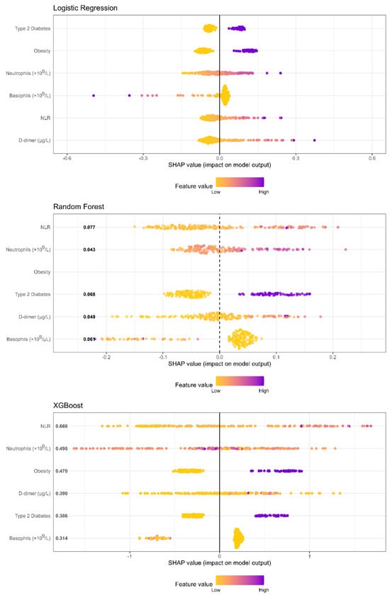 Table 2 presents the performance metrics of the machine learning models trained, while the ROC curve analysis for each model is presented in Figure 2. Among the selected models trained using a classification threshold of 0.5, XGBoost demonstrated the best performance. Figure 3 highlights the importance of predictor features estimated using SHAP values, providing insights into the individual contributions of each variable to the models’ predictions. Consistency in the relevance of certain variables was observed, although their order and magnitude differed across the evaluated models. NLR and neutrophils emerged as the most significant features in both random forest and XGBoost, indicating that the neutrophil-to-lymphocyte ratio (NLR) and absolute neutrophil count are robust predictors for the target variable. Similarly, D-dimer levels and obesity showed high relevance across all three models, underscoring their consistent role in predictions. On the other hand, type 2 diabetes mellitus and basophils exhibited moderate and stable contributions, although their relative importance varied slightly among the models. These observations reflect how each model, depending on its complexity and structure, prioritizes different relationships between variables and outcomes.