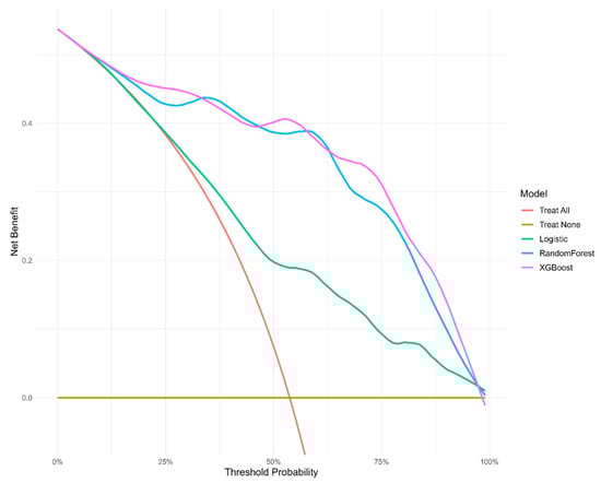 To evaluate the clinical utility of the developed predictive models, a decision curve analysis (DCA) was performed. DCA is a methodology that assesses the net benefit of using a predictive model compared to standard intervention strategies (treating all patients vs. treating none) across different probability thresholds [32]. The model compares the number of true positives to the unnecessary interventions (false positives), weighing them according to the threshold probability at which ICU admission would be clinically justified. DCA was implemented using the rmda v.1.6 (risk model decision analysis) package in RStudio. Decision curves were constructed for each model (logistic regression, random forest, and XGBoost), calculating the net benefit at various probability thresholds. This allowed visualization and comparison of the models’ performance in terms of their ability to correctly identify patients requiring ICU admission, plotting the net benefit for a range of threshold probabilities [33].