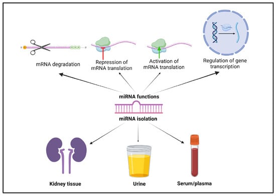 The miRNA expression profile is time-dependent and tissue-specific during embryogenesis and throughout life []. miRNAs are not only expressed in tissue, but are also found to be differentially expressed in blood and urine (Figure 1). This fact makes miRNAs plausible non-invasive kidney disease biomarkers. As has already been proven in some cancers [,,], a correlation could be established between kidney disease prognosis and the presence of specifically deregulated miRNAs. Indeed, urinary microRNAs have been evaluated as potential biomarkers of glomerulopathies. A recent study found five miRNAs with 100% specificity and sensitivity for the diagnosis of IgA nephropathy in humans []. Another study explored how the expression levels of miRNAs can be used to differentiate between diabetic kidney disease and focal segmental glomerulosclerosis, revealing distinct expression patterns []. However, the role of the identified miRNAs in these conditions’ corresponding pathology has not been clarified, nor has the presence of these miRNAs in kidney tissue been confirmed.