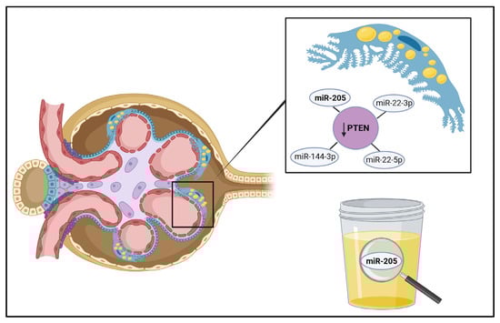 - miR-205 []: The PTEN gene (phosphatase and tensin homolog) is essential in kidney health, particularly in relation to inflammation and podocyte injury, in which case it is regulated by various miRNAs [,]. Its inhibition has been associated with several obesity-related pathways, including enhanced muscle regeneration [], mitochondrial dysfunction [], endoplasmic reticulum stress [], increased renal inflammation and fibrosis [] and the promotion of insulin resistance []. Interestingly, podocytes in patients with ORG have shown increased lipid endocytosis, which has been linked to reduced PTEN expression []. In this model, Wistar Han rats were fed with a standard diet or an HFD for 10 weeks. It was proven that the downregulation of PTEN in the kidneys of the HFD group was driven by interactions between miR-205, miR-22-3p, miR-22-5p and miR-144-3p, and was associated with increased lipid uptake in podocytes (Figure 2). Notably, miR-205 was not only upregulated in the kidneys of rats with ORG, but was also found to be differentially expressed in their urine (Figure 2). Furthermore, the increase in the mesangial matrix and podocyte hypertrophy observed in these animals correlated with changes in miRNA expression in both kidney tissue and urine.