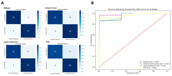 Comparative performance of machine learning models: (A) Confusion matrix visualizing classification outcomes. (B) ROC curves and AUC values illustrating model discriminative ability.