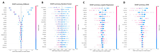 SHAP feature contribution analysis for (A) XGBoost, (B) Random Forest, (C) Logistic Regression, (D) SVM. Each subplot visualizes SHAP values, indicating the contribution of selected features to model predictions.