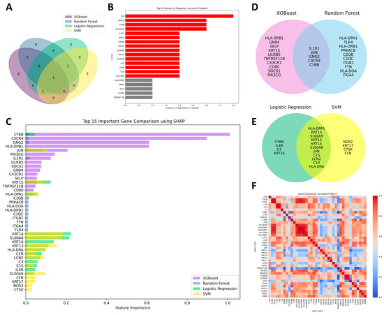 A total of 60 genes selected by machine learning models, with each model identifying its top 15 feature genes (Figure 5). Figure 5A presents the overall overlap of selected genes among the four models, displaying intersection counts without gene names. The top 20 most frequently selected features across all model subsets are highlighted as shown in Figure 5B. JUN was the only gene that appeared in all model subsets, followed by KRT15, CYBB, and HLA-DPA1. Additionally, IL1R1, GNG2, CXCR4, KRT13, KRT14, S100A8, S100A9, C1S, LCN2, C1R, and HLA-DRA were present in at least two of the four model subsets. We further examined which machine learning models selected each feature gene and assessed the degree of similarity in gene selection among the models. We compared the overlap of selected feature genes across models and visualized their intersections (Figure 5C). To investigate the relationships between specific models, we focused on the genes commonly selected by XGBoost and Random Forest and the shared genes between Logistic Regression and SVM (Figure 5D,E). These visualizations provide insights into the consistency of feature selection across different machine learning models. IL1R1, JUN, GNG2, CXCR4, and CYBB were identified as common genes for XGBoost and Random Forest, while HLA-DPA1, KRT13, KRT14, KRT15, S100A8, S100A9, JUN, C1S, LCN2, C1R, and HLA-DRA were shared between Logistic Regression and SVM. We further performed correlation analysis on the datasets after feature selection by the four ML models. The heatmap represents the Pearson correlation matrix of the 40 feature genes selected by the machine learning models (Figure 5F). These findings suggested that XGBoost and Random Forest shared similarities in their feature importance evaluation methods because they both are decision tree-based models. Although SVM employed a nonlinear radial basis function (RBF) kernel in our study, both Logistic Regression and SVM exhibited greater overlap in feature selection due to their shared tendency to select features that contribute significantly to the decision boundaries, particularly when the data revealed clearer patterns that may not require highly complex nonlinear modeling. Overall, these results highlight the importance of model choice in feature selection, as well as the relationship between the data characteristics and the ability of each model to capture relevant patterns.