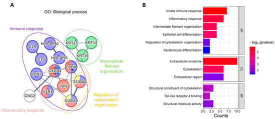 Functional analysis of top 45 feature genes shared across the three datasets: (A) functional relationships among genes and (B) Gene Ontology (GO) functional enrichment analysis.