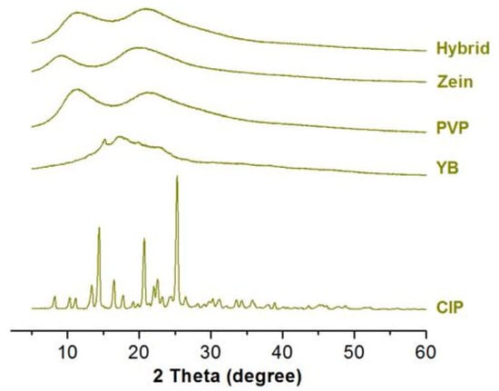 XRD spectra of CIP, YB, PVP, Zein, and Hybrid.