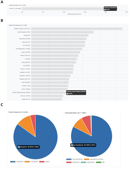 The frequency of p53 mutations in breast cancer patients according to the TP53 Database (https://tp53.isb-cgc.org/ [accessed on 1 July 2024]). The data show that (A) the mutation rate of p53 in breast cancer patients is 3749/16,445 (22.8%) and (B) the mutation rate of p53 in breast cancer patients in Taiwan is 20%. (C) Among samples harboring point mutations in the TP53 gene, the majority (84.92%) were classified as missense mutations. Of these, 82.59% resulted in non-functional p53 protein, indicating a substantial loss of tumor suppressor activity in most cases.