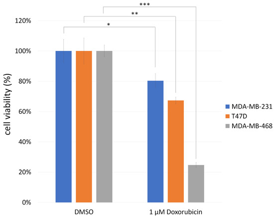 The differences in survival rates between three different breast cancer cell lines after treatment with doxorubicin. MDA-MB-231, T47D, and MDA-MB-468 breast cancer cell lines were treated with 1 μM doxorubicin for 48 h to assess chemotherapeutic response. Following treatment, cell viability was determined using the CCK-8 assay. Viability in the DMSO-treated control group was set as 100% and used as a reference to normalize the results from doxorubicin-treated group. Data are presented as the mean ± standard deviation (SD) from three independent experiments (n = 3). (*, p < 0.05; **, p < 0.01; ***, p < 0.001).