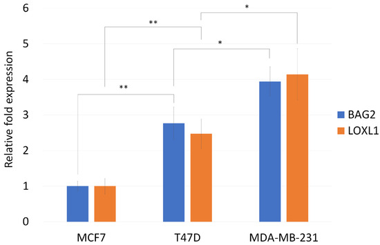Comparison of the expression levels of BAG2 and LOXL1 in various breast cancer cells. Real-time RT-PCR was used to analyze the expression of BAG2 and LOXL1 in various breast cancer cells. It was found that the expression of both BAG2 and LOXL1 in MDA-MB-231 and T47D was higher than that in MCF7 (the expression of MCF7 was set as 1). The results are displayed as mean ± SD, n = 3 (*, p < 0.05; **, p < 0.01).