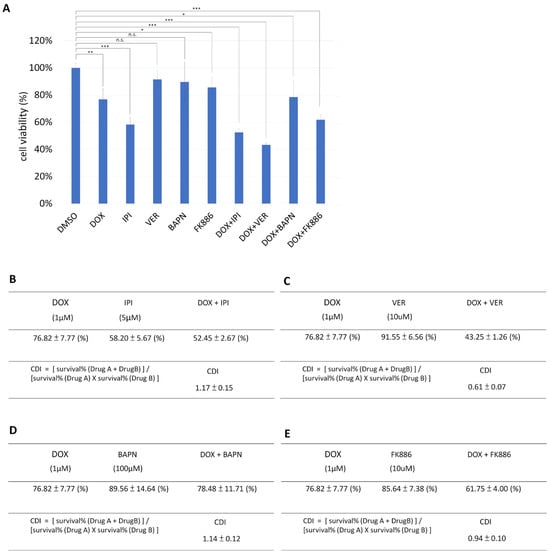 Comparison of the survival rate differences in the breast cancer cell line MDA-MB-231 after co-treatment with various misfolding p53 aggregation inhibitors and doxorubicin. (A) Cells were treated with the chemotherapy drug doxorubicin (DOX, 1 μM) and the following concentrations of each misfolding p53 aggregation inhibitor: HSP90 inhibitor (IPI-504, 5 μM), HSP70 inhibitor (VER-155008, 10 μM), LOX inhibitor (BAPN, 100 μM), and NAMPT inhibitor (FK886, 10 μM). After 48 h of drug treatment, cell survival rates were assessed using CCK8 reagent. DMSO only was calculated as 100% to normalize other treatment conditions. Results are presented as mean ± SD, n = 3 (*, p < 0.05; **, p < 0.01; ***, p < 0.001; n.s., p > 0.05). (B) Calculation of the drug interaction coefficient (CDI) between doxorubicin and HSP90 inhibitor (IPI-504) in MDA-MB-231 cells. According to the cell survival rate calculations from the CCK8 assay, the CDI value is 1.17, indicating that doxorubicin and IPI-504 have no synergistic cytotoxic effect on MDA-MB-231 cells. (C) Calculation of CDI for doxorubicin and HSP70 inhibitor (VER-155008) in MDA-MB-231 cells. Based on the cell survival rate calculations from the CCK8 assay, the CDI value is 0.61, indicating that doxorubicin and VER-155008 exhibit a significant synergistic cytotoxic effect on MDA-MB-231 cells. (D) Calculation of CDI between doxorubicin and the LOX inhibitor BAPN in MDA-MB-231 cells. According to the CCK8 assay cell survival rate calculations, the CDI value is 1.14, indicating that doxorubicin and BAPN had no drug synergistic cytotoxic effect on MDA-MB-231 cells. (E) Calculation of CDI between doxorubicin and FK886 in MDA-MB-231 cells. Based on the cell survival rate calculations from the CCK8 assay, the CDI value is 0.94, indicating that doxorubicin and FK886 had a synergistic cytotoxic effect on MDA-MB-231 cells.