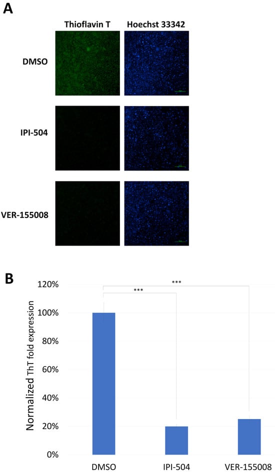 ThT signaling in MDA-MB-231 cancer cells following treatment with IPI-504 or VER-155008. (A) MDA-MB-231 cells were treated with DMSO only, 5 μM of the HSP90 inhibitor IPI-504, or 10 μM of the HSP70 inhibitor VER-155008. After 48 h of treatment, the cells were co-stained with ThT and Hoechst 33342. ThT was used to detect protein aggregation (green), while Hoechst 33342 served as a nuclear counterstain (blue). Scale bar: 100 µm (20× magnification). (B) The optical density (OD) ratio of ThT to Hoechst 33342 and ThT intensity in the DMSO group were set to 1 for normalization across conditions. As shown, ThT intensity was significantly reduced following treatment with IPI-504 or VER-155008. Data are presented as mean ± SD, n = 3 (***, p < 0.001).
