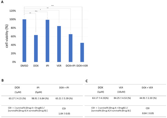 The cytotoxic effect of anticancer drugs may lead to cell necrosis or apoptosis. In the execution phase of apoptosis, the activation of several caspases is a key mechanism [21,22,23]. Thus, we used the broad caspase inhibitor z-VAD-FMK to test whether the cell cytotoxicity induced by co-treatment with doxorubicin and HSP70 inhibitor (VER-155008) could be reversed. It was found that z-VAD-FMK did indeed reverse the cytotoxic effect of cells co-treated with doxorubicin and VER-155008, significantly increasing the cell survival rate (Figure 8A). Therefore, we concluded that co-treatment of breast cancer cells with doxorubicin and VER-155008 did induce apoptosis.