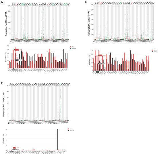 Expression profiles of Hsp70 family members in breast invasive carcinoma (BRCA). (A) According to the GEPIA2 database (http://gepia2.cancer-pku.cn/, accessed on 3 April 2025), HSPA1A is significantly highly expressed in BRCA compared to healthy tissue. A red word at the top indicates that the gene expression is significantly increased in cancer samples for this cancer type, while a green word signifies a significant decrease in expression. (B) According to the GEPIA2 database (http://gepia2.cancer-pku.cn/, accessed on 3 April 2025), HSPA1B is significantly highly expressed in BRCA compared to healthy tissue. (C) According to the GEPIA2 database (http://gepia2.cancer-pku.cn/, accessed on 3 April 2025), HSPA1L is expressed at low levels in all types of cancers but expressed at high levels in normal testis.