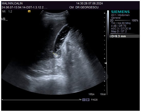 A 55-year-old male patient, complaining of recently onset, persistent generalized itching, was first examined by a dermatologist in the middle of May 2024 and no physical signs of skin disorder were found. Routine blood and stool workups were performed. No food or respiratory allergies were identified, and stool samples were negative for parasites. The recommended antihistamines were only partially effective, pruritus being present even during nights, resulting in a lowering of the patient’s quality of life. Given the mild dyspeptic-associated complaints, the patient was referred to a gastroenterological consultation on 7 June 2024 with a suspected biliary disorder. Medical history revealed no significant familial or personal pathologies, no smoking or alcohol drinking and no exposure to toxic substances. Physical examination found no particular pathological features, no peripheral palpable lymph nodes or skin lesions, normal respiratory and cardiovascular aspects, and blood pressure = 120/70 mmHg. However, the patient was overweight (BMI = 28 kg/m2) and displayed a mild palpatory tenderness of the middle and upper-right abdominal quadrant. Abdominal duplex ultrasound revealed multiple small echogenic formations adjacent to the gallbladder wall, likely cholesterol polyps. As illustrated in Figure 1 and Figure 2, two small calculi were also visualized in the infundibular zone. No biliary tree dilation was observed. Additional findings included mild liver steatosis, thickening of the stomach and duodenal walls, and a hyperechoic pancreatic texture. Aortic ectasia (2.7 cm in diameter) was noted just proximal to the distal bifurcation. No ascites or retroperitoneal lymph nodes were present.