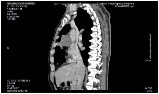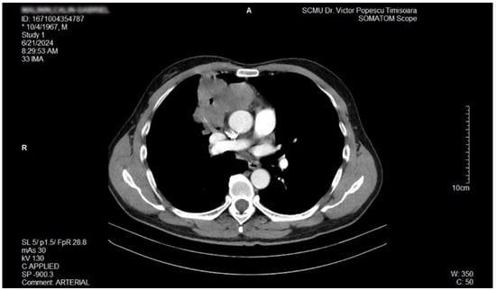 The proposal for H. pylori eradication treatment was initially postponed by the patient. However, the patient received symbiotics in order to alleviate the gut microbiota dysbiosis and also DAO supplementation, aiming at reducing the systemic effects of bacterial histamine overproduction. Further imaging studies were, however, ordered in the context of persistent, treatment-resistant pruritus that lasted for more than 6 weeks and eventually became suspicious for a malignancy. So that thorax and abdomen computed tomography (CT) were recommended and performed soon after, on 21 June 2024. As depicted in Figure 3, Figure 4 and Figure 5, a large right mid-thoracic tumoral formation with mediastinal extension of 7.8 cm/5 cm and a satellite lymph node of 7 mm placed in the anterior aspect of the upper right pulmonary lobe were discovered. The image was considered highly suspicious of lymphoma or pulmonary malignancy.