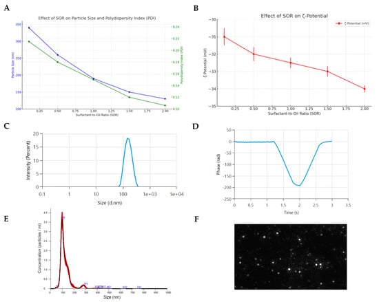 Physicochemical characterization of optimized RSV-SLN. (A) Effect of SOR on size and polydispersity index (PDI). (B) Effect of SOR on ζ-potential. (C,D) Particle size and ζ-potential measured by DLS. (E) NTA measurement of RSV-SLN in suspension. (F) The frame is a representative screenshot of the NTA video.