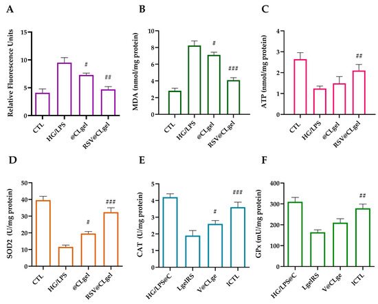 ROS-scavenging ability of RSV@CLgel in hPDLSCs cell0 macrophages. (A) ROS production as determined by the DCF fluorescence intensity. (B) MDA level, (C) ATP generation, (D) superoxide dismutase (SOD2), (E) catalase (CAT), and (F) glutathione peroxidase (GPx) activities were measured using the commercial assay kit. Treatment with HG/LPS (25 mM + 100 μg/mL) represents a positive control. Results are expressed as the means of three independent experiments, S.D. (n = 3). # p < 0.05, ## p < 0.01 and ### p < 0.001 versus HG/LPS.