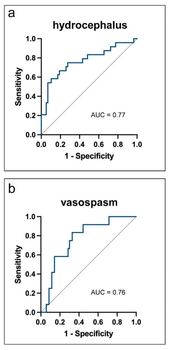 In multivariate regression analysis, hemorrhage volume remained the strongest independent factor associated with hydrocephalus (p = 0.032, OR = 1.28, 95% CI: 1.02–1.61) and vasospasm (p = 0.005, OR = 1.25, 95% CI: 1.07–1.46), whereas no variable showed a significant association with DCI (Table S2). The predictive performance of hemorrhage volume for hydrocephalus and vasospasm was further evaluated using ROC curves. The ROC curve for hydrocephalus (Figure 2a) showed an AUC of 0.77, indicating acceptable predictive performance. Similarly, the ROC curve for vasospasm (Figure 2b) yielded an AUC of 0.76, indicating a comparable predictive ability.