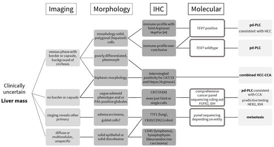 Practical guide to clinically uncertain liver masses, essentially combining morphology, immunohistochemistry, and molecular testing. TERT—telomerase reverse transcriptase promoter; pd-PLC—poorly differentiated primary liver cancer; HCC—hepatocellular carcinoma; combined HCC-CCA—combined hepatocellular cholangiocarcinoma; CCA—cholangiocarcinoma.