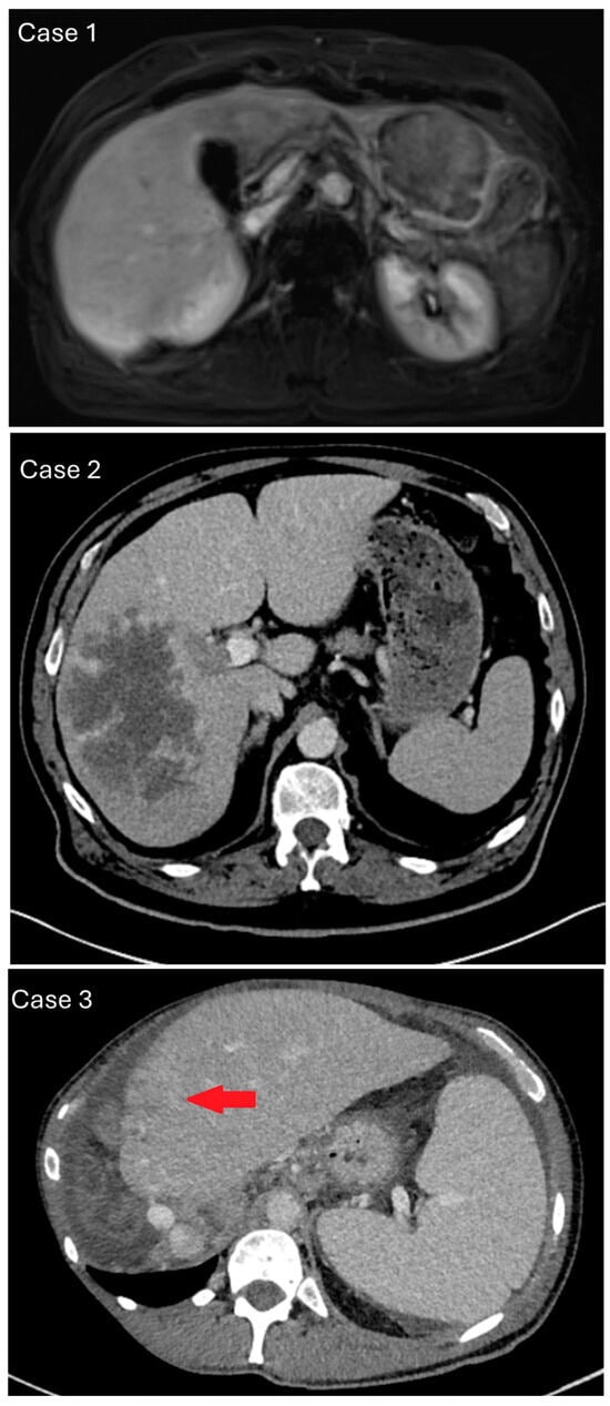 Representative chronological imaging of the case series. Upper panel/case 1: contrast-enhanced magnetic resonance imaging, arterial rim enhancement of approx. 6 cm large, suspicious liver lesion in segment II/III without CCA-typical capsular retraction. Middle panel/case 2: contrast-enhanced computed tomography, venous phase with cauliflower-like mass of right liver without border or capsule, suggesting intrahepatic cholangiocarcinoma (iCCA). Recognizable macrovascular infiltration, which is more common in hepatocellular carcinoma. Lower panel/case 3: contrast-enhanced computed tomography and a new, rim-enhancing mass in liver segment II with capsular retraction and signs of macrovascular infiltration (red arrow).