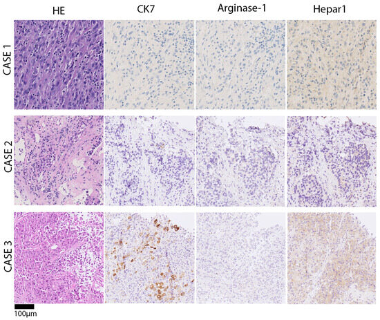 Three patients with clinically uncertain liver masses are reported. Imaging studies were performed as contrast-enhanced CT or MRI scans, but radiology left diagnosis open. Other primaries could not be detected. Biopsies were performed as recommended for non-cirrhotic patients or indeterminate nodules > 1 cm in size [5,33]. The tissue samples were formalin-fixed, paraffin-embedded, and cut into 3 µm slides (liver tumor protocol: hematoxylin–eosin, elastica–van-Gieson, periodic–acid shift). Case 1 was a liver segment resection specimen; Case 2 and 3 were transjugular liver biopsies (both < 1 cm in length) with limited amounts of tissue. The morphology revealed solid growth and poor differentiation (G3) according to the 5th edition of the WHO classification [34]. Based on the work by Kikuchi et al., we further categorized samples as polygonal/hepatoid, pleomorph, or vaguely adenoid [6]. Immunohistochemistry staining included a minimum panel of hepatocyte-specific Arginase1 (sensitivity > 90%, specificity 94%), HepPar1 (sensitivity > 90%, specificity 97%), and cholangiocyte CK7/CK19 (Table 1) [35]. For Arginase1, we used clone SP156 (dilution 1:100), a monoclonal rabbit antibody (CellMarque, Rocklin, CA, USA). For HepPar1, we used OCH1E5 at a dilution of 1:200 (Roche Diagnostics, Rotkreuz, Switzerland). CK7 had the following parameters: clone OV-TL12/30 and dilution 1:800. Searching for BAP1 (BSB-109, BioSB, Santa Barbara, CA, USA), Glypican (1G12, CellMarque, Rocklin, CA, USA), and AFP (polyclonal, Dako, Santa Clara, CA, USA) expression supplemented the panel with HCC- and CCA-specific alterations. Only the resection specimen could be further stained for other primary origins: TTF1 (SPT24, Novacastra, Biosystems, Muttenz, Switzerland), PAX8 (RM436, BioSB, Santa Barbara, CA, USA), PSA (polyclonal, Dako, Santa Clara, CA, USA), CK20 (Ks20.8, CellMarque, Rocklin, CA, USA), CDX2 (EPR2764Y, CellMarque), HMB45 (monoclonal, CellMarque), MelanA (A103, Dako), SOX11 (MRQ-58, CellMarque), CD45 (PD7/26, 2B11, Dako), CD10 (56C6, Novacastra). This was because of continuous uncertainty about other primaries.