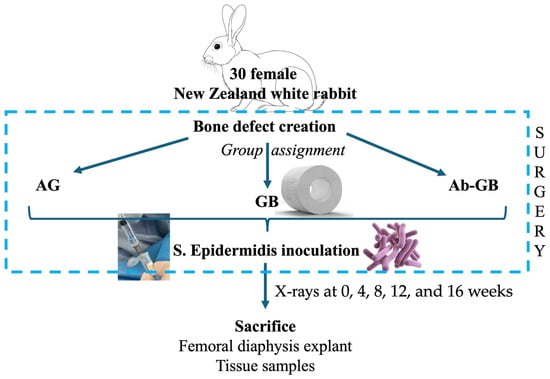 Thirty skeletally mature New Zealand white rabbits were used. As shown in Figure 1, the rabbits were assigned in a ratio 1:1:1 to one of three experimental groups: (A) antibacterial GreenBone scaffold, (B) non-loaded GreenBone scaffold, and (C) rabbit bone allograft. A critical-size femoral defect was surgically created. At the end of surgery, the bone defect was inoculated percutaneously with 0.5 × 107 colony-forming units (CFU)/0.5 mL of Staphylococcus epidermidis (ATCC® 12228™, LGC Standards, Sesto San Giovanni, Italy). Radiographic evaluations were performed at 0, 4, 8, 12, and 16 weeks. Macroscopical, micro-CT, and histological analyses were performed after euthanasia at 16 weeks. Moreover, blood and tissue samples were collected to evaluate systemic and immunological reactions to the implant.