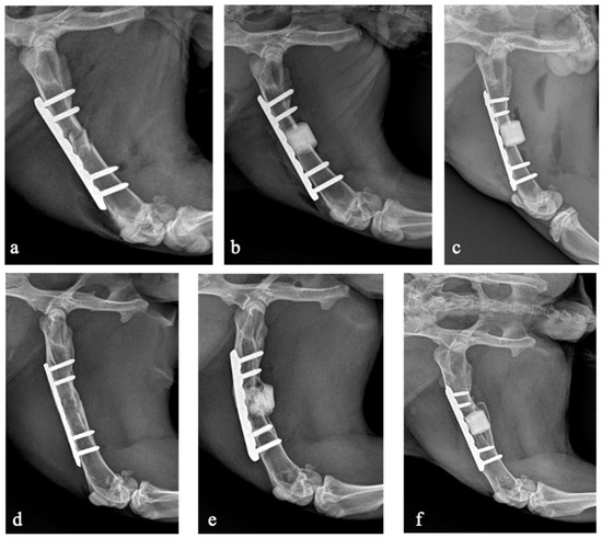 Radiographic examinations with X-rays were performed by blinded evaluators at the Lodi University Veterinary Hospital at 0, 4, 8, 12, and 16 weeks following appropriate anesthetic premedication. The first examination was conducted on the same day as the surgery, immediately after the procedure, while the final examination took place on the day of the animal’s sacrifice.