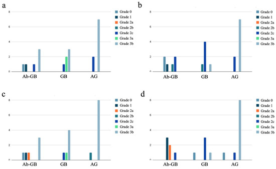Distribution of newly formed bone maturity grades divided by experimental groups into the four different areas: proximal cortical (a), proximal intramedullary (b), distal cortical (c), and distal intramedullary (d).