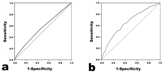 The results of the Harada score analysis are presented in Figure 1. The AUC was 0.558 (95% confidence interval 0.546–0.569). When the cutoff value of the Harada score for predicting CAA was set to ≥4, the sensitivity was 0.541, the specificity was 0.547, the positive predictive value was 0.208, and the negative predictive value was 0.845.