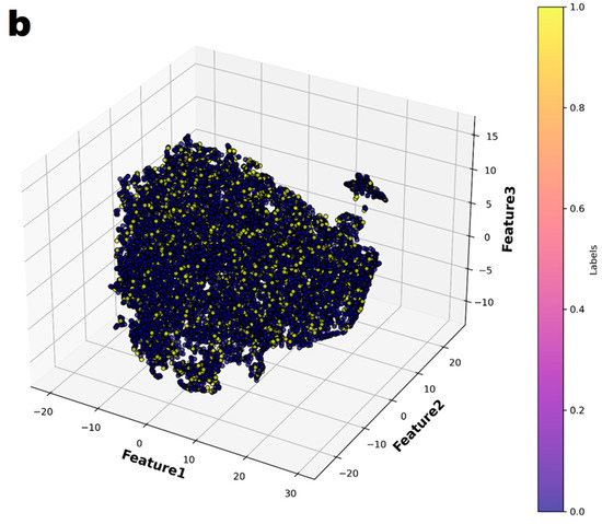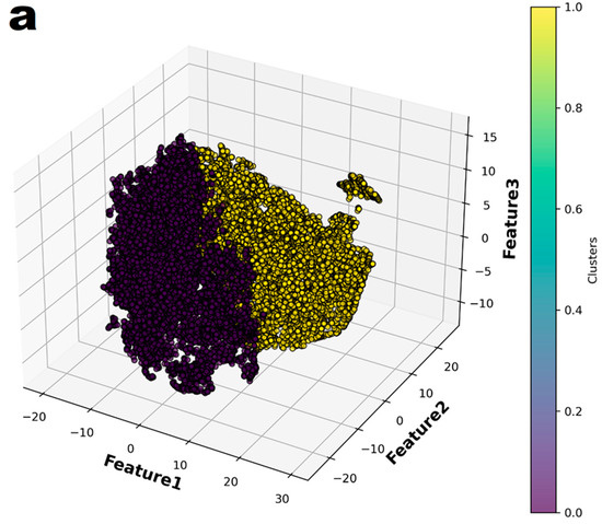 Principal component analysis was first performed on the set of features. Afterwards, the high-dimensional dataset was reduced to three dimensions using the t-distributed Stochastic Neighbor Embedding (t-SNE) algorithm to facilitate visualization and enhance clustering efficiency. To uncover inherent group structures in the data, an unsupervised clustering approach was applied using the K-Means algorithm. t-SNE is a dimensionality reduction technique that preserves local similarities in high-dimensional data, making it particularly effective for visualizing complex structures. K-Means algorithm is a clustering method that partitions data into K clusters by minimizing intra-cluster variance, providing efficient and interpretable groupings. The optimal number of clusters was set to two, and the algorithm was initialized with a random state to ensure consistency.
