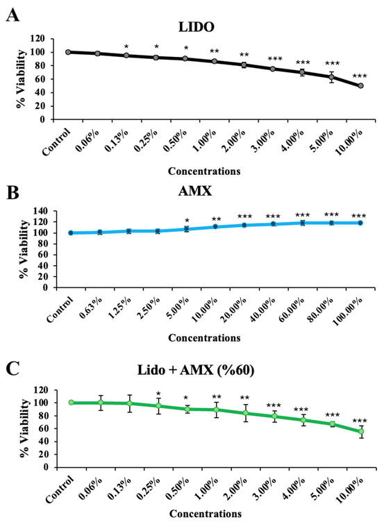 When combined, AMX demonstrated a cytoprotective effect against LIDO-induced cytotoxicity, as evidenced by the statistically significant differences between the LIDO and LIDO + AMX groups at concentrations above 2% (p < 0.05), see Figure 1.