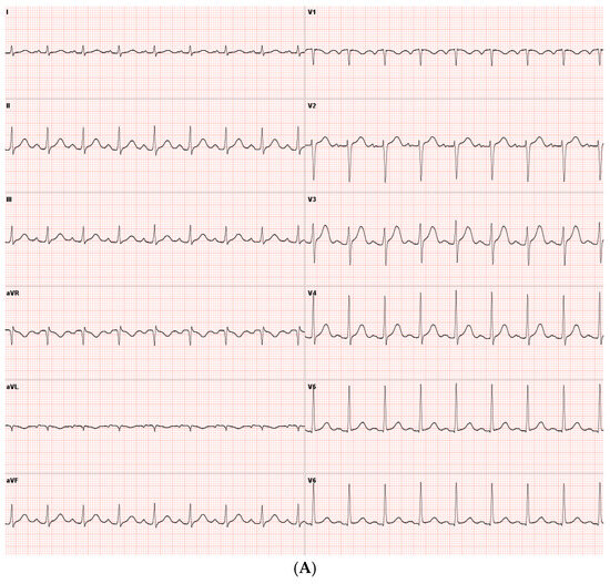 A 44-year-old Caucasian man was admitted to the Intensive Care Unit (ICU) due to acute respiratory distress syndrome associated with pneumonia, requiring invasive mechanical ventilation. The electrocardiogram (ECG) at admission showed sinus tachycardia, without evidence of prior or ongoing ischemia and with normal left ventricular repolarization (Figure 1A). On physical examination, a 4/6 apical pansystolic murmur was detected, along with clinical signs of heart failure. The patient exhibited signs of an inflammatory syndrome, although blood cultures were negative. To rule out infective endocarditis, transthoracic (TTE) and transesophageal echocardiography (TEE) were performed. Although no vegetations were observed, imaging revealed significant mitral and aortic valve disease. Specifically, there was severe PML hypoplasia, while the anterior mitral leaflet (AML) was elongated, thickened, and prolapsing, resulting in severe primary mitral regurgitation (MR). Additionally, the patient was found to have a type I L-R bicuspid aortic valve with moderate aortic regurgitation (vena contracta 4 mm) (Figure 2, Table 1). Cardiac computed tomography confirmed the presence of a bicuspid aortic valve and excluded proximal aortic dilatation and coronary artery disease. A few months later, the patient underwent cardiac surgery. Mitral valve repair was not feasible due to the abnormal morphology of the PML, and the patient underwent concomitant mitral and aortic valve replacement with mechanical prostheses. The AML was myxomatous and exhibited multiple chordal ruptures, while the PML appeared small, retracted, and fibrotic. Operative specimens from the mitral and aortic valves are shown in Figure 3. The postoperative course was uneventful, and the patient was discharged seven days after surgery.