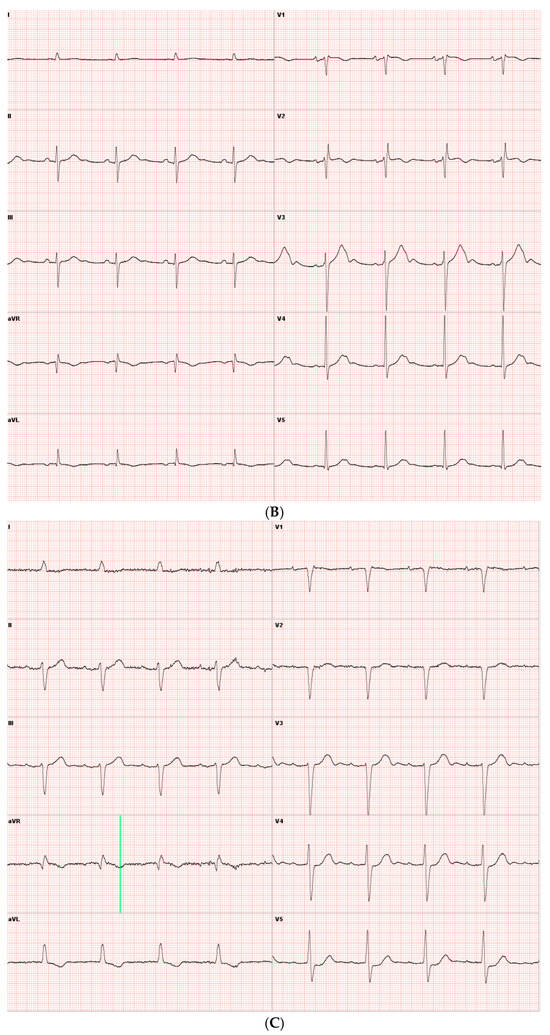 (A) ECG obtained in Case 1, showing sinus rhythm without signs of ischemia and normal left ventricular repolarization. (B) ECG obtained in Case 2 after atrial fibrillation cardioversion, showing sinus rhythm, incomplete right bundle branch block, no signs of ischemia, and normal left ventricular repolarization. (C) ECG obtained in Case 3, showing showed sinus rhythm and incomplete left bundle branch block.