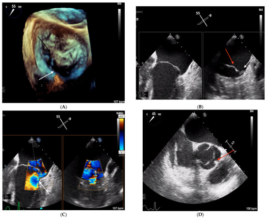 TEE images obtained in Clinical Case 1. (A) 3D TEE “en face” view of mitral valve showing a severely hypoplastic PML (white arrow) and an elongated and prolapsing AML (black arrow). (B) 2D TEE image at 55° mid-esophageal level (left panel) showing the elongated AML. The X plan in A1P1 (right panel) shows a large AML (red arrow) and severe PML hypoplasia (white arrow). (C) Color Doppler 2D TEE 55° mid-esophageal view (left panel) showing the severe, eccentric MR jet (white arrow) and the orthogonal plane crossing A1/P1, where the origin of the MR jet is located (right panel). (D) 2D TEE image at 45° showing type 1 L-R bicuspid aortic valve. The red arrow indicates cup fusion.