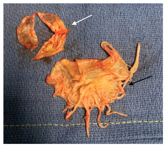 Operative samples of Case 1. The white arrow indicates the aortic valve sample showing the Type 1 L-R bicuspid aortic valve. The black arrow indicates the mixoïd AML sample.