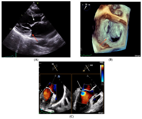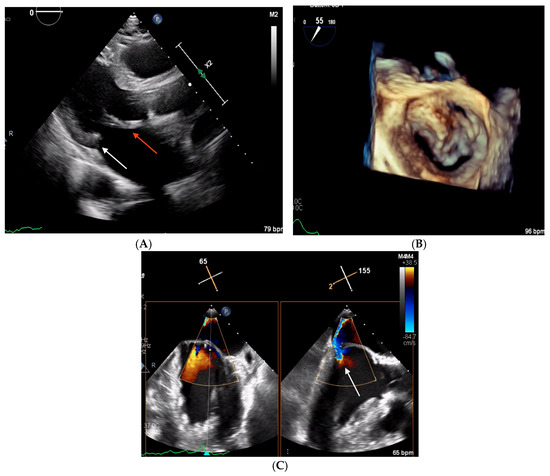 Echocardiographic images obtained in Clinical Case 2. (A) TTE parasternal long-axis view showing a thickened AML (white arrow) and an hypoplastic PML (red arrow). (B) 3D TEE “en face” view of the mitral valve showing severe PML hypoplasia with only a small P1 scallop (red arrow). (C) 2D TEE 55° mid-esophageal view (left panel) and the orthogonal plane crossing A2/P2, where the origin of the MR jet is located (right panel, white arrow).