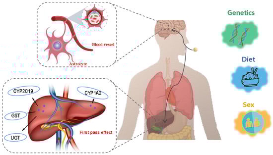 Inter-individual genetic variability, sex, age, and diet have been demonstrated to exert great influences on the pharmacokinetics of antidepressants (Figure 4), as the metabolized activity of enzymes such as liver drug enzymes and the tight degree of the blood-brain barrier are closely related to these factors [64,65]. Consequently, the administration of the same antidepressant can result in substantial differences in efficacy among individuals. These variations among patients pose a considerable challenge to the development of effective personalized antidepressant therapies [66].