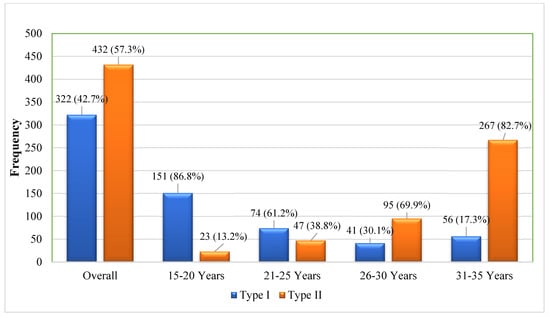 The study population (N = 754) comprised 322 cases (42.7%) of type 1 diabetes mellitus (T1DM) and 432 cases (57.3%) of type 2 diabetes mellitus (T2DM), with a mean age at diagnosis of 26.14 ± 6.53 years. Age-stratified analysis revealed the expected predominance of T1DM in younger cohorts (15–19 years) and T2DM in older participants (31–35 years; 86.7%). Notably, we observed atypical presentations, including T1DM in older age groups and T2DM in younger individuals (Figure 1).