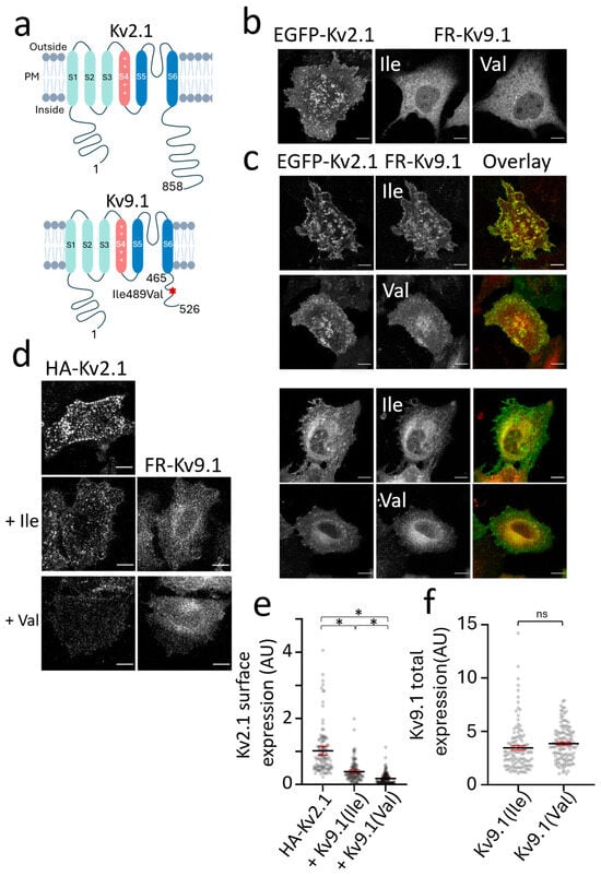3.1. Both Kv9.1Ile and Kv9.1Val Co-Localise with Kv2 Channel Clusters at the Plasma Membrane but Reduce Kv2 Surface Expression and Cluster Size