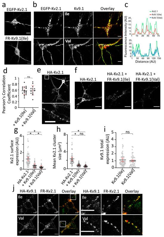 We next compared the distribution of Kv2.1 and Kv9.1 channels expressed in primary hippocampal cultures to determine if there were differences in channel distribution in post-mitotic cells compared to HeLa cells. Alone, Kv2.1 showed distinct clustering behaviour that was predominantly at the cell soma and in proximal neurites, whereas Kv9.1 expression was diffuse and surrounded the nucleus, consistent with localisation to the ER (Figure 2a). Upon the co-expression of Kv9.1 variants with Kv2.1, the distribution of both Kv9.1 variants became clustered, and these clusters showed a high degree of co-localisation with Kv2.1 at the soma and along the neurites, as revealed by line plots of intensity as a function of distance (Figure 2b,c). As a way of comparing the extent to which the two Kv9.1 variants co-localised with Kv2.1, we calculated Pearson’s Correlation (PC) coefficients for individual cells, and there was no significant difference between the two variants (Figure 2d). To further analyse the PM expression of these channels, we carried out the immunolabelling of HA-Kv2.1 with and without Kv9.1Ile and Kv9.1Val, and the immunolabelling of HA-Kv9.1 variants with and without Kv2.1 in live neurons. Surface clusters of HA-Kv2.1 expressed alone were predominantly at the soma and in proximal neurites, but punctate expression was also apparent throughout the distal processes (Figure 2e). The co-expression of either of the Kv9.1 variants reduced the surface labelling of Kv2.1 and reduced the size of Kv2.1 clusters at the cell soma (Figure 2f–h). Similar to HeLa cells, the Kv9.1Val variant produced a significantly greater reduction in Kv2.1 surface expression compared to the Kv9.1Ile variant (~5-fold and ~3-fold, respectively) (p < 0.0001), a difference that was not attributable to a difference in the expression levels of the two variants (Figure 2i). The surface labelling of HA-Kv9.1 variants was not detectable when expressed alone, but both showed punctate labelling in the soma and along neurites when co-expressed with Kv2.1, and these puncta co-localised with EGFP-Kv2.1 (Figure 2j).