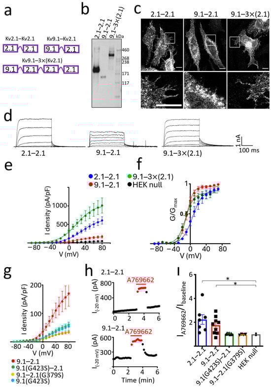 Concatamers of Kv9.1 and Kv2.1 suggest that both a 2:2 and 1:3 stoichiometry is permitted for Kv9.1−Kv2.1 heteromeric complexes. (a) Design of dimers comprising Kv2.1 linked to Kv2.1 (2.1−2.1) (top left) and Kv9.1Ile linked to Kv2.1 (9.1−2.1) (top right) and a tetrameric concatemer encoding one Kv9.1Ile linked to three Kv2.1 subunits (9.1−3×(2.1)) (bottom). (b) Dimers of 2.1−2.1 and 9.1−2.1 and the tetrameric concatemer 9.1−3×(2.1) were expressed in HEK293 cells, and surface proteins were purified by biotinylation and isolation on streptavidin resin and probed with anti-Kv2.1 antibody following separation on a 3–8% Tris acetate gel. (c) Immunostaining with anti-Kv2.1 following expression of the concatamers in HeLa cells showed PM expression for all but greater retention of the 9.1−2.1 dimer within the ER as evidenced by the outline of the nucleus. White inset box is displayed below, showing a zoomed-in area of cells highlighting the PM expression of 2.1−2.1 and 9.1−3×(2.1) and the ER retention of 9.1−2.1. (d) Representative whole cell currents recorded from HEK293 cells were evoked by stepping the membrane potential from −100 mV to between −40 mV and +20 mV in 10 mV steps for 300 ms. Tail currents were measured at −40 mV. (e) Peak current densities were calculated, and cells expressing the 9.1−2.1 dimer had reduced currents compared to the 2.1−2.1 dimer and 9.1−3×(2.1) tetramer (n = 8 for 2.1−2.1, n = 7 for 9.1−2.1, n = 7 for 9.1−3×(2.1)). (f) The hyperpolarising shift in the voltage dependence of channel activation for both 9.1−2.1 and 9.1−3×(2.1) compared to the 2.1−2.1 dimer. V50 values (mean ± 95% CI) were 5.7 ± 4.4 mV (n = 8) for 2.1−2.1, −9.1 ± 1.8 mV (n = 7) for 9.1−2.1, and −11.8 ± 3.0 mV (n = 7) for 9.1−3×(2.1). (g) Mutations were made in either the Kv9.1 subunit (G423S) or Kv2.1 subunit (G379S) of the 9.1−2.1 dimer. Both mutations reduced the peak current densities to a level similar to cells expressing Kv9.1(G423S) alone (n = 9 for 9.1−2.1, n = 7 for 9.1G423S-2.1, n = 4 for 9.1−2.1G379S, n = 3 for Kv9.1G423S). (h) Currents were evoked by stepping the voltage from a holding potential of −100 mV to −20 mV at 5 s intervals, and peak current amplitudes were measured before, during and after washout of the AMPK activator A769662 (100 µM) and plotted as a function of time. Onset and recovery of the potentiating effect of A769662 were rapid. Results are shown for the 2.1−2.1 dimer (top graph) and the 9.1−2.1 dimer (bottom graph). (i) The fold increase in the peak current amplitude in the presence of A769662 is shown for 2.1−2.1, 9.1−2.1 and both mutant 9.1−2.1 dimers, with individual data points shown plus the mean ± SEM. A Welch’s ANOVA was performed, followed by post-hoc comparisons using Dunnett’s T3 test, * p < 0.05.